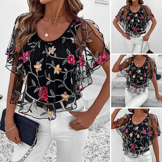Moteriška nėriniuota palaidinė su tinklelio raštu