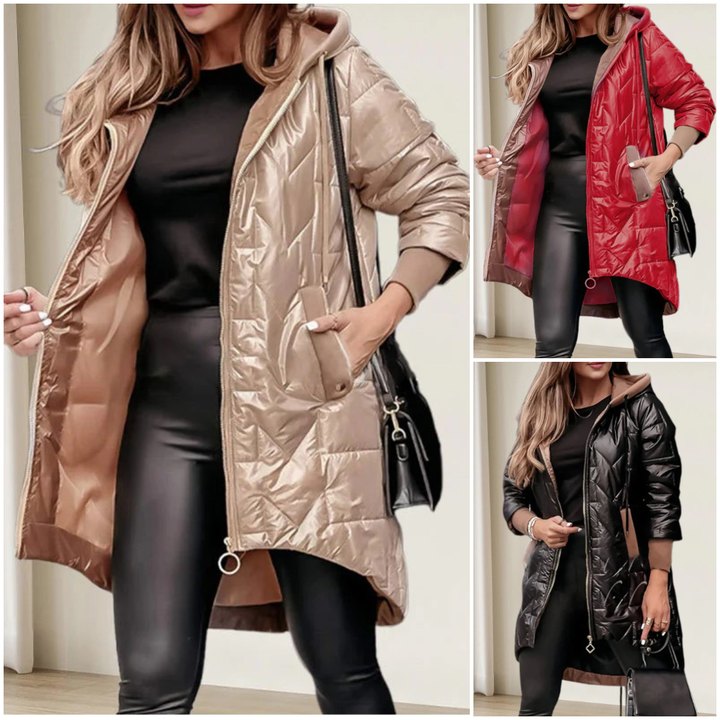 Vienspalvė moteriška ilga striukė su gobtuvu